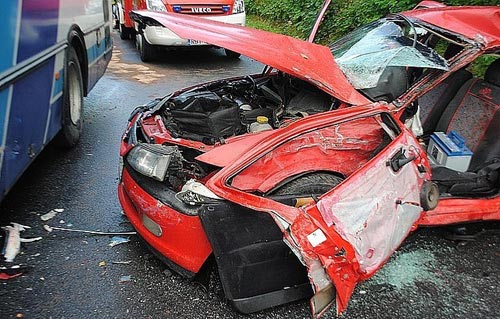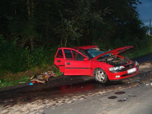 W opisanej sytuacji zderzenie byo nieuniknione, niewiadome byo tylko czy bdzie ono czoowe, czy te髒 czoowo boczne. W ostatniej chwili Opel Vectra skrci w prawo i pot髒nym uderzeniem wpad na autobus zelizgujc si swoim lewym bokiem, po lewym przednim naro髒niku autobusu. Ostatecznie czerwona osob籀wka zatrzymaa si mniej wicej w poowie autobusu stajc przodem do jego lewego boku. Jeden z pasa髒er籀w autobusu tak opisuje cae zdarzenie: „Opel "wyskoczy" zza zakrtu z ogromn prdkoci i by ju髒 na naszym pasie ruchu i "czo籀wka" bya przesdzona. W ostatnim momencie Opel Vectra obr籀ci si w prawo i lewym swym bokiem z ogromn si uderzy w nasz autobus. Widok rannych by przera髒ajcy!!” Podobnie wspomina kierowca autobusu: „Nagle zza zakrtu wyjecha czerwony osobowy samoch籀d, wali prosto na mnie a ja nie miaem 髒adnych mo髒liwoci manewru. Po zderzeniu mylaem przede wszystkim o ewakuowaniu pasa髒er籀w, bojc si wybuchu paliwa w Oplu oraz o zabezpieczeniu drogi, aby kolejny pojazd nie najecha na nas zza ostrego zakrtu.” Dla porzdku dodam tylko, 髒e obaj kierowcy byli trze驕wi, co potwierdzio badanie policyjnym alkomatem.