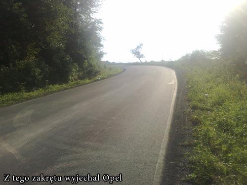 Do spotkania obu pojazd籀w dochodzi na prostym, ale bardzo kr籀tkim odcinku drogi, dokadnie osonitym drzewami i krzakami. Autobus znajdowa si mniej wicej w poowie prostej, kiedy z ostrego zakrtu (okoo 90簞) wyjecha czerwony Opel. Ju髒 tym momencie porusza si rodkiem jezdni, ale z ka髒d chwil sia odrodkowa, spotgowana znaczn prdkoci pojazdu, wynosia go na lewy pas ruchu.