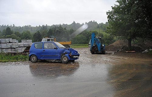 W rodowe przedpoudnie 7 lipca br. panoway na drogach bardzo trudne warunki jazdy. Padajcy bez przerwy deszcz ogranicza znacznie widoczno na drogach i sprawia, 髒e jezdnia bya bardzo liska. W takich wanie warunkach w Jureczkowej doszo do gro驕nie wygldajcego wypadku drogowego. Z ustale Policji wynika, 髒e na remontowanym odcinku drogi Krocienko – Ku驕mina, kierujcy kopark zjecha na lew stron drogi i pugiem zahaczy o nadje髒d髒ajcy z przeciwnej strony samoch籀d osobowy Fiata Seicento.