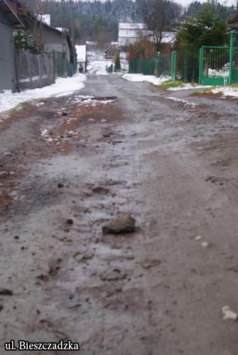 Jeszcze gorzej wyglda to na ulicy Dwernickiego w kierunku ulicy Bieszczadzkiej. Tutaj zapadnita ulica, kt籀rej tym mianem raczej nazwa nie mo髒na, czy te髒 wystajce studzienki powoduj, 髒e ka髒da pr籀ba przejechania t ulic nara髒a pojazd na powa髒ne uszkodzenie.