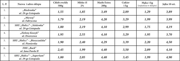 Zgodnie z zapowiedzi z poprzedniego numeru „Naszych Poonin” rozpoczynamy publikowanie rankingu cen towar籀w w sklepach. Celem publikacji jest uatwienie 髒ycia naszym czytelnikom, poprzez zaprezentowanie cen na podstawowe artykuy majce wpyw na bud髒et domowy w r籀髒nych plac籀wkach handlowych. W nastpnych wydaniach gazety bdziemy kontynuowa nasz cykl. Zamierzamy kolejno obejmowa rankingiem podstawowe towary spo髒ywcze oraz przemysowe w r籀髒nych miejscowociach na terenie powiat籀w bieszczadzkiego i leskiego. Na pierwszy ogie wzilimy sze podstawowych artyku籀w spo髒ywczych z kilku wybranych sklep籀w na terenie Ustrzyk Dolnych.