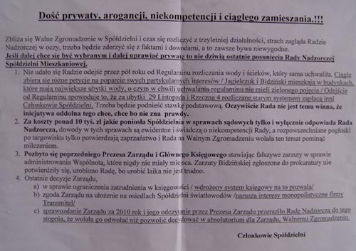 Do prywaty, arogancji, niekompetencji i cigego zamieszania – to midzy innymi moglimy przeczyta na ulotce, kt籀r porozwieszano na drzwiach budynk籀w nale髒cych do sp籀dzielni mieszkaniowej „Pionierska” w Ustrzykach Dolnych. Podpisani pod ulotk czonkowie sp籀dzielni stawiaj Radzie Nadzorczej o wiele wiksze i powa髒niejsze zarzuty ni髒 te cytowane wczeniej. Kropl kt籀ra przepenia czar byo odwoanie przez Rad obecnie urzdujcego prezesa. Zdaniem sp籀dzielc籀w by to strach Rady przed konsekwencjami podjtych przez Zarzd Sp籀dzielni decyzji, a same odwoanie prezesa na dwa tygodnie przed Walnym Zgromadzeniem sp籀dzielni, uniemo髒liwieniem Walnemu Zgromadzeniu mo髒liwoci decydowania o absolutorium dla Zarzdu. Jak si zakoczy ta sp籀dzielcza, wewntrzna wojna przekonamy si pewnie niebawem . Na dziewitego kwietnia zaplanowano Walne Zgromadzenie Sp籀dzielni. Tam pewnie dowiemy si czy zarzuty stawiane Radzie Nadzorczej maj swoje odzwierciedlenie w rzeczywistoci i czy determinacja czonk籀w sp籀dzielni bdzie tak du髒a by odwoa obecnie urzdujc Rad. Poni髒ej zamieszczamy dostarczon do Redakcji przez sp籀dzielc籀w ulotk.