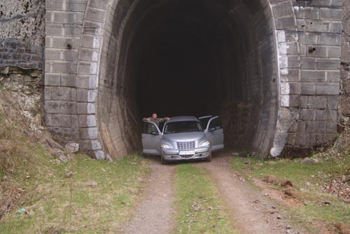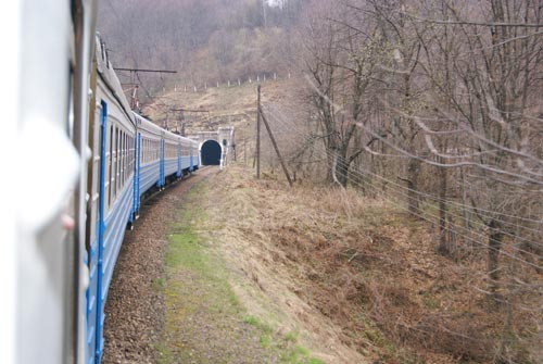 Z Ustrzyk do Woosianki jest okoo 120 km. Trasa wiedzie przez przejcie graniczne w Krocienku, Chyr籀w, Stary Sambor, Turk i przecz U髒ock. Droga nie najlepsza szczeg籀lnie odcinek od granicy do Starego Sambora. P籀驕niej jak na ukraiskie warunki znacznie lepiej. Za przecz trasa wiedzie krtymi serpentynami 300 metr籀w w d籀 do miejscowoci U髒ok. Stad ju髒 tylko kilka kilometr籀w do Woosianki, celu naszej podr籀髒y. Jak si okazuje stacja kolejowa w Woosiance pozytywnie zaskakuje, czysto, schludnie. Niestety jeli ju髒 kto chce skorzysta z ubikacji to czeka go sanitarne rozczarowanie. Po przyje驕dzie do Woosianki nie zd髒ylimy na pierwszy pocig do Sianek o godz. 11,00 czasu ukraiskiego, czyli o 10,00 czasu polskiego. Nastpny pocig za dwie godziny. Mielimy wobec tego sporo czasu do odjazdu, wic porozmawialimy z zawiadowc i jego kolega Miszk. Dowiedzielimy si, 髒e turyci pojawiaj si na tej trasie coraz czciej, cho dla nich byo tajemnic co ich tutaj cignie. Trasa kolejowa, jak trasa. Dla nich czynna od zawsze, czca zakarpackie z obwodem lwowskim. Wyjaniamy, 髒e atrakcj jest dziewi tuneli tylko na odcinku do Sianek. Przejazd przez wysokie na kilkadziesit metr籀w wiadukty. Sowem atrakcja jakich mao w caej Europie. Miszka poprawia, 髒e tuneli jest osiem bo jeden zosta wyczony z ruchu. Na dodatek proponuje, 髒e nas tam mo髒e zawie驕. Decydujemy si natychmiast. Dziesi hrywien i butelka w籀dki dopenia transakcji. W drodze do U髒oku na kocu Woosianki skrcamy w lewo i po jakim kilometrze kiepskiej, ale przejezdnej drogi jestemy na starym torowisku. Dalej mo髒na te髒 jecha samochodem osobowym. Po 500 m doje髒d髒amy do tunelu. Miszka m籀wi, 髒e ma on okoo 300 metr籀w dugoci i mo髒na wjecha do niego autem. W poowie tunelu zakrt i egipskie ciemnoci. Nie wida wlotu tunelu, ani wylotu, wra髒enie niesamowite, warte wydanych pienidzy. Na dodatek mao kto wie o mo髒liwoci obejrzenie tego tunelu. Wszystkie pozostae, czynne obstawione s przez uzbrojon stra髒, a ten nie.