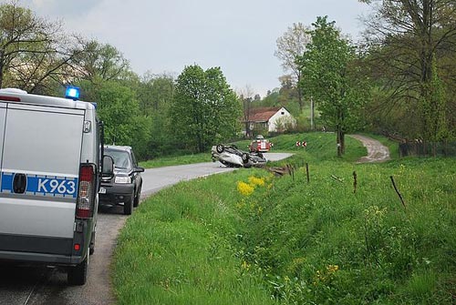 19 maja po poudniu doszo do gro驕nie wygldajcej kolizji drogowej. Prawdopodobnie nadmierna prdko i niedostosowanie jej do warunk籀w atmosferycznych bya przyczyn kolizji. Kierujcy toyot avensis 24-letni mieszkaniec gminy Sanok po wyjechaniu z uku drogi straci panowanie nad pojazdem i zjecha do przydro髒nego rowu uderzajc w przepust, po czym pojazd wyrzucio na praw stron jezdni odwracajc go jednoczenie na dach.