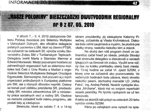 Sowackie pismo „Nadeja” jest pismem Sowackiego Zwizku SM, czyli zwizku ludzi chorych na stwardnienie rozsiane. Pooniny czsto pisz o polskich, a szczeg籀lnie miejscowych dziaaczach Polskiego Zwizku Chorych na SM. Rok temu ukaza si w „Naszych Pooninach” materia ze zjazdu takich organizacji z kilku kraj籀w Europy rodkowej.