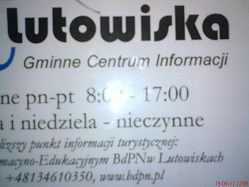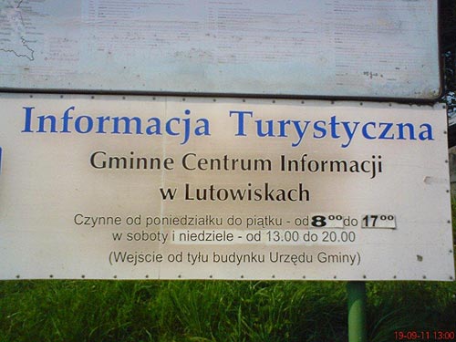 Po kilku dniach pobytu i wejciu na Ostry Dzia (niestety o tej porze paralotniarzy ju髒 tu nie ma) wybraem si do Mucznego, aby z Arniki wej na Bukowe Berdo. Dla zapoznania si z propozycjami dla turyst籀w zatrzymaem si w Lutowiskach, gdzie tablica przed domem towarowym naprzeciwko Urzdu Gminy podaje godziny pracy Centrum Informacji zar籀wno od poniedziaku do pitku jak i w sobot i niedziel.