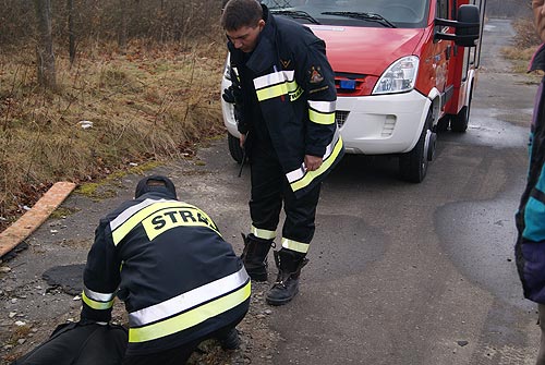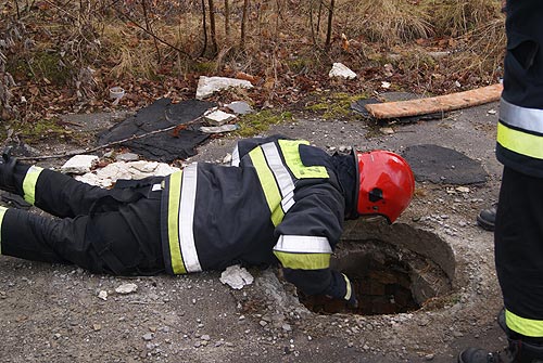 Kilka dni temu wybraem si na spacer z psem. Obeszlimy stoki 驍ukowa i po jaki dw籀ch godzinach postanowiem wraca do domu. Nie wiem czemu ale wybraem powr籀t do domu przez bye zakady drzewne, a konkretnie przez byy zakad pyt wi籀rowych. Pogoda bya pikna, ludzi brak wic pies m籀g si wyszale bez smyczy. W pewnym momencie zostawi mnie i dobieg do miejsca gdzie z asfaltu wystawaa jaka deska. Miejsca tego ju髒 nie opuci, szczeka i biega wokoo. Gdy tam doszedem zorientowaem si, 髒e jest to studzienka kanalizacyjna gboka na jakie 1,5 m. W studzience siedzia przestraszony kudaty piesek. Deska, kt籀r kto wo髒y do studzienki moga uatwi wyjcie z niej kotu, a nie psu. Pies albo wpad do niej sam, albo go kto tam wrzuci i ruszony sumieniem wsadzi desk, kt籀ra miaa mu umo髒liwi wyjcie. Niestety nie miaem rkawic i nie mogem pr籀bowa wyciga psa samemu. Poza tym byo jednak do gboko i bez wskoczenia do studzienki nie udao by mi si tego zrobi. Pobiegem wic do domu i zadzwoniem do Stra髒y Po髒arnej w Ustrzykach. Mylaem, 髒e moje zgoszenie przyjm ze sceptyzmem i bd oddala w nieskoczono czas przyjazdu. Okazao si jednak, 髒e zgoszenie zostao przyjte natychmiast i dy髒urujcy stra髒ak kaza mi od razu wyj na ulic by skierowa stra髒ak籀w w miejsce gdzie znajduje si feralna studzienka. Stra髒acy przyjechali zabrali mnie i dojechalimy byskawicznie do studzienki. A na miejscu wszystko poszo ju髒 szybo i sprawnie. Jeden ze stra髒ak籀w wskoczy do studzienki, zapa psa, poda go koledze, kt籀ry asekurowa go na powierzchni i w niespena dwie minuty pechowy pies by na powierzchni. Nie zd髒yem mu nawet zrobi zdjcie, bo on tylko zamerda ogonem i pobieg w sobie tylko znanym kierunku. Stra髒acy zabezpieczyli otw籀r studzienki, spakowali si i tak szybko jak si pojawili, odjechali. Zostay na szczcie zdjcia z akcji bo przezornie zabraem na ni z sob aparat.