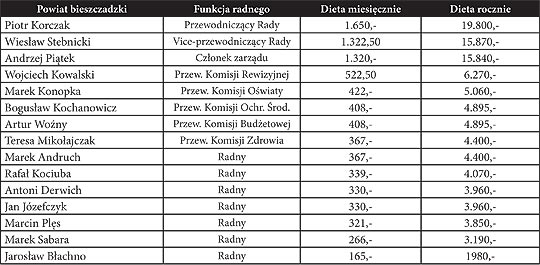 cznie daje to kwot 102.440,- z . Jednak by byo mo髒liwe realne por籀wnanie tych kwot z powiatem leskim trzeba odj 15.840 z jak pobra czonek zarzdu Andrzej Pitek, kt籀ry nie jest radnym. Pitnastym radnym w powiecie jest starosta Krzysztof Gsior, kt籀ry diety nie pobiera. Tak wic radni powiatu bieszczadzkiego kosztowali samorzd 86.600 z. To niewiele. Najprawdopodobniej 髒aden polski samorzd powiatowy nie wya paca ni髒szej kwoty ni髒 powiat bieszczadzki. Jest to o prawie 13 tysicy z mniej ni髒 w roku 2010.