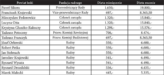 Kwoty diet radnych powiatu leskiego niewiele si r籀髒ni w por籀wnaniu z dietami radnych poprzedniej kadencji. W tej kadencji uby jeden wiceprzewodniczcy rady. Powiat leski ma wyra驕nie wicej funkcyjnych os籀b w radzie ni髒 powiat bieszczadzki. Przyczyna jest nadzwyczaj prosta, funkcjami obdarzyo si tam wszystkich czonk籀w rzdzcej powiatem koalicji. List siedmiu radnych uzupenia starosta. Dlatego te髒 mimo i髒 powiat leski jedynie nieznacznie przewy髒sza liczb mieszkac籀w powiat bieszczadzki, to na diety udzie tutaj o 1/3 wicej pienidzy ni髒 w powiecie bieszczadzkim. Lescy radni pobrali w cigu roku 136.811,- z. Jest to mniej wicej tyle samo co rok wczeniej.