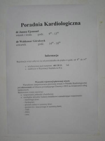 Poradnia jest czynna, w ka髒dy wtorek, rod i czwartek. Przyjmuje w niej r籀wnie髒 doktor Waldemar G籀ralczyk, obecny ordynator oddziau wewntrznego. Taki tandem dobrze rokuje chorym.