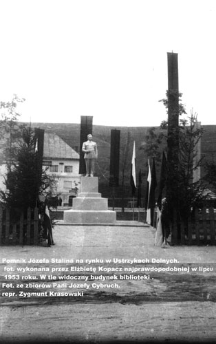 Zapada decyzja o usuniciu pomnika J籀zefa Wisarionowicza. W asycie du髒ej grupy mieszkac籀w, pomnik zosta opasany sznurami do kt籀rych zaprzgnito konie, bdce wasnoci Miejskiej Rady, a powo髒one przez pana Ostyskiego. Pierwsze podejcie byo nieudane bo z pomnika odpada tylko gowa. cignito posiki i po rcznym podkuciu pomnika udao si oderwa posta Stalina od podstawy. Konie zawloky betonow posta nad brzeg rzeki Strwi髒 w okolicach biurowca dzisiejszego Nadlenictwa Ustrzyki Dolne. Resztki pomnika przele髒ay tam kilka lat i zostay u髒yte do umacnia brzeg籀w Strwi髒a podczas prac regulacyjnych dokonanych na pocztku lat szedziesitych ubiegego wieku.