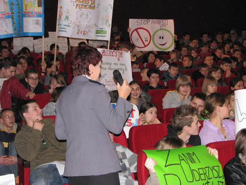 Komenda Powiatowa Policji w Ustrzykach Dolnych zorganizowała debatę o przemocy w szkole dla młodzieży gimnazjalnej powiatu bieszczadzkiego. W dniu 08 grudnia w debacie wzięła udział młodzież z ustrzyckich gimnazjów. Natomiast w dniu 09 grudnia udział w debacie wzięli uczniowie gimnazjów powiatu bieszczadzkiego. Debatę poprzedzało spotkanie z dyrektorami szkół, którzy wyrazili chęć wzięcia udziału i przygotowania uczniów do dyskusji o problemach przemocy. Na terenie działania ustrzyckiej policji nie notujemy zdarzeń o tym charakterze. Jednak pragniemy zwracać uwagę, przestrzegać i uczyć młodzież prawidłowych zachowań w szkole i poza nią. Ważnym aspektem społecznej dyskusji było zwrócenie uwagi młodzieży na fakt, że nie można bezkarnie przyglądać się złym, agresywnym zachowaniom. W tym celu zaprosiliśmy ekspertów: kuratora sądowego, psychologa , księdza, policjanta, przedstawiciela szkoły którzy omówili sposoby agresywnych zachowań, radzenia sobie z problemem agresji, przedstawili gdzie szukać pomocy, omówili kwestie odpowiedzialności karnej za nieudzielenie pomocy osobie potrzebującej, namawiania i podżegania do bójki oraz środki jakie zastosuje wobec agresorów Sąd dla Nieletnich.