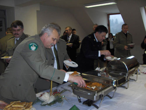 Licznie przybyli zaproszeni przez Stra髒 Graniczn gocie reprezentujcy: wadze samorzdowe Powiatu Bieszczadzkiego i Gminy Ustrzyki Dolne, Komendy Powiatowe Policji i Stra髒y Po髒arnej, Su髒b Celn, su髒b zdrowia oraz wiele innych instytucji. Wsp籀lne koldowanie, moc wzajemnie skadanych serdecznych 髒ycze witeczno-noworocznych oraz niezwykle smaczny posiek wigilijny zaserwowany przez ustrzyck Restauracj „Nied驕wiadek” dopeniy reszty. Niestety, specyfika su髒by na granicy spowodowaa, 髒e w uroczystoci uczestniczya niewielka reprezentacja funkcjonariuszy Stra髒y Granicznej, pozostali znajdowali si na swoich posterunkach. W zwizku z tym przypomniay mi si sowa starej piosenki pogranicznik籀w „gdy Ty pisz kraju strze髒e kto tu, by Ci nikt nie zbudzi ze snu”. Obok kr籀tki fotoreporta髒 z uroczystoci.