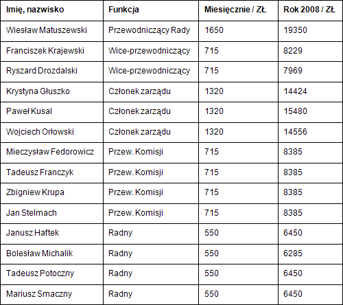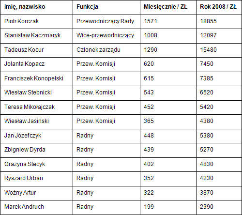 Radny Marek Andruch jest czonkiem tylko jednej komisji, std te髒 jego najni髒sza rednia dieta. Radny Wiesaw Jasiski jest czonkiem trzech komisji, jednak patna dieta przysuguje radnemu tylko za udzia w dw籀ch komisjach. Pitnastym radnym jest wice-starosta Zygmunt Krasowski. Poza poborami nie pobiera on jednak diety radnego.