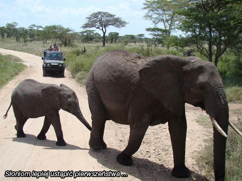 Po zaliczeniu Kilimand髒aro udalimy si na piciodniowe safari, bya to swego rodzaju nagroda za wysiek wo髒ony w wypraw na najwy髒szy szczyt Afryki. Zabralimy ze sob tylko niezbdny ekwipunek, pozostae baga髒e zostay w hotelu. Podr籀髒 odbywalimy terenowymi samochodami marki Toyota a biega ona drogami gruntowymi, przewa髒nie o nawierzchni szutrowej. Kierowca samochodu by r籀wnoczenie przewodnikiem i tropicielem. Z samochodu podziwialimy wspaniaoci afrykaskiej sawanny. Ze wzgld籀w bezpieczestwa, samoch籀d mo髒na byo opuszcza tylko i wycznie w miejscach do tego wyznaczonych. Nocowalimy pod namiotami rozbijanymi w wyznaczonych do tego celu obozowiskach. Trasa naszego bezkrwawego afrykaskiego safari biega przez tereny czterech park籀w narodowych na terytorium Tanzanii. Pierwszym by Park Narodowy Tarangire, poo髒ony nad rzek o tej samej nazwie. Kolejnym by Park Narodowy Serengeti, najwikszy i najbardziej znany z tanzaskich park籀w. Rocznie odwiedza go okoo 90 tysicy turyst籀w, ale nie jest to zbyt wiele je髒eli wzi pod uwag powierzchni Serengeti wynoszc prawie 15 tysicy kilometr籀w kwadratowych. Dla por籀wnania powierzchnia Wojew籀dztwa Podkarpackiego jest niewiele wiksza. Ngorongoro to krater, a waciwie kaldera wygasego wulkanu. Wyjtkowe wra髒enie robi ta wielka niecka o rednicy 18 kilometr籀w i gbokoci 600 metr籀w. Wspaniaa rolinno i pena gama zwierzt afrykaskich, kt籀re podobno przechodz przez koron krateru powoduj, 髒e widok ten na zawsze zapisuje si w pamici turyst籀w. Park Narodowy Jeziora Manyara by ostatnim na trasie safari. Kr籀luj w nim ptaki 髒yjce wok籀 pytkiego sodkowodnego jeziora. Na skutek zr籀髒nicowanego poziomu wody, powierzchnia jego stale si zmienia i rednio wynosi okoo 230 kilometr籀w kwadratowych. Niestety trafilimy na niski stan wody i wspaniay ptasi raj moglimy podziwia tylko z daleka. Zbli髒enie si lustra wody uniemo髒liwiay rozlege mokrada. Podczas safari udao si nam zobaczy pi najbardziej niebezpiecznych wielkich zwierzt Czarnego Ldu, zwanych wielk afrykask pitk. Nale髒 do niej so afrykaski, lew, baw籀 afrykaski, lampart i nosoro髒ec czarny. Najwiksze wra髒enie robi jednak bezkresna sawanna upstrzona gdzieniegdzie parasolowatymi akacjami a na niej liczce po kilkadziesit sztuk stada soni, bawo籀w i antylop oraz rzadziej spotykane kilkunasto osobnikowe stadka pozornie ospaych lw籀w. Wszystkie zwierzta przyzwyczajone s do samochod籀w i prawie zupenie nie reaguj na ich widok. Owe prawie dotyczy napotkanej sonicy. Podczas przechodzenia przez drog co j zdenerwowao i ruszya w kierunku naszego samochodu. Kierowca, kt籀ry chwil wczeniej wyczy silnik, nie by w stanie go uruchomi. Zrobio si niebezpiecznie. Na szczcie okoo trzech metr籀w od pojazdu przy pomocy trby obsypaa nas piaskiem i pod髒ya za stadem. Poza obszarem park籀w uwag przykuwa pasterskie plemi Masaj籀w zajmujce si od wiek籀w wypasem byda, charakterystyczne s noszone przez nich dugie bambusowe tyczki a we wioskach, plecione okrge chaty. Nasza afrykaska przygoda zakoczya si wizyt na Zanzibarze, wyspie poo髒onej 50 kilometr籀w od wybrze髒a Afryki na Oceanie Indyjskim. Na tej afrykaskiej wyspie panuje zupenie inna cywilizacja, zwizana z kultur arabsk i hindusk. Kamienne domy z typowymi dla kultury arabskiej portalami drzwiowymi i mieszkacy, g籀wnie muzumanie, co wida po ubiorach kobiet w wikszoci noszcych czadory. W przeszoci wyspa syna z handlu niewolnikami, to std byli oni ekspediowani do Ameryki. Zanzibar jest bardzo wa髒nym producentem go驕dzik籀w, s tu r籀wnie髒 wielkie plantacje palm kokosowych i agawy sizalowej z kt籀rej otrzymuje si wytrzymae w籀kno u髒ywane do produkcji powroz籀w. To na tej wyspie urodzi si i spdzi dziecistwo Farrokh Bulsara bardziej znany jako Freddie Mercury, zao髒yciel i wokalista legendarnej grypy Queen. Potga Oceanu Indyjskiego agodzcego gorce afrykaskie powietrze sprawia, 髒e klimat Zanzibaru przyciga wielu zagranicznych turyst籀w.