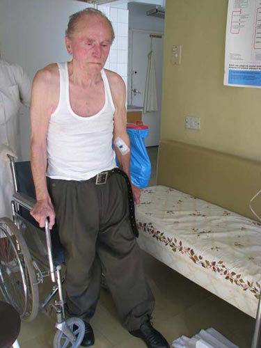 M髒czyzna ubrany by podkoszulek biay na ramiczkach, spodnie ciemnostalowe materiaowe, pas czarny sk籀rzany typu „policyjny” skarpety czarne, p籀buty sk籀ropodobne koloru czarnego z czarnym sznur籀wkami, kurtka jasnopopielata typu letniego ze cigaczem w dolnej czci, sweter bez rkaw籀w koloru be髒owego z brzowymi liniami wok籀 szyi, ramion i tuowia, czapka z daszkiem koloru niebieskiego. M髒czyzna ten porusza si o kulach.