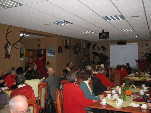 Msz wit rozpoczynajc spotkanie poprowadzili ks. Janik oraz ks. przewodnik Piotr Bartnik. Nastpnie gocie opr籀cz 髒ycze i amania si opatkiem usyszeli w kawiarni w. Franciszka interesujce wystpienia zaproszonych goci. Pan dr. Edward Marszaek z Regionalnej Dyrekcji Las籀w Pastwowych w Kronie przedstawi znakomite „Gawdy o zwierztach”, prezentujc r籀wnie髒 swoj wydan niedawno pozycj „Las peen zwierza”.