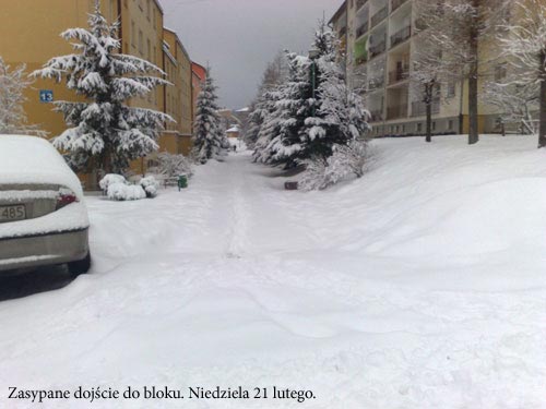 Tegoroczna zima jest niezbyt mro驕na i nie髒na, ale kilka dni z intensywnymi opadami niegu dao si wszystkim troch we znaki. Tak si pechowo zo髒yo, 髒e trzy z owych nie髒nych dni przypady na soboty i sobotnie noce, std niedzielny poranek przywita nas zasypanymi chodnikami i ulicami. Mieszkacy ustrzyckiego osiedla mieszkaniowego udajcy si na niedzieln Msz wit czciowo poruszali si odnie髒onymi chodnikami a czciowo brnli po ydki w niegu.