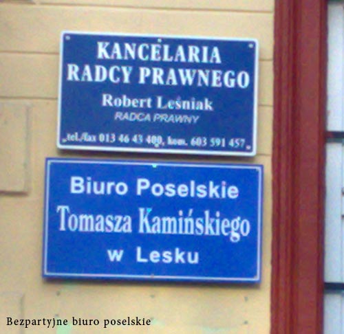 Na cianie budynku poo髒onego w Lesku przy Placu Konstytucji 3-go Maja, rzuca si w oczy bkitna tablica z wyra驕nym napisem „Biuro Poselskie Tomasza Kamiskiego”. Zadziwi mnie brak nazwy partii politycznej, kt籀r pose Kamiski reprezentuje w Sejmie RP.