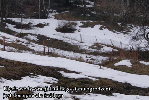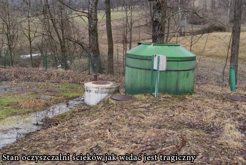 Oczyszczalnia ścieków położona w bezpośrednim sąsiedztwie budynków, jest w prawdzie ogrodzona, ale teren samej oczyszczalni bardzo zaniedbany. Widać, że od dość dawna nie były tu prowadzone solidne prace porządkowe. Dzień naszych odwiedzin był dość chłodny, temperatura wynosiła ledwie kilka stopni powyżej zera, ale i tak w pobliżu oczyszczalni dawał o sobie znać niemiły zapach. Dopiero na miejscu okazało się, że do wybudowanego dla potrzeb budynków leśnych wodociągu jest podłączona prawie cała wieś, a co najmniej 10 gospodarstw.