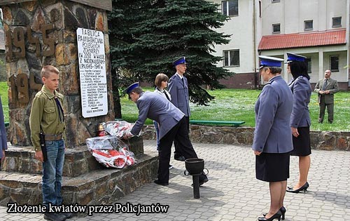 Przed tym samym pomniku delegacja funkcjonariuszy zo髒ya wizank wie髒ych kwiat籀w.